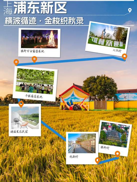 这条线路串联起浦东新区的多个特色休闲点位,既能体验乡村风情与田园野趣,也能享受亲子时光与夜游乐趣。七灶村以“盐港皂村、烟火七灶”为主题,保留船坞旧址、百年皂荚树等历史印记,周边的棋杆百亩露营基地和迪诺星辰民宿是亲子出游的好选择。此外,纯新村的“横波梳状”水田、哥特式教堂与多家民宿,棋杆村的千亩葡萄园、稻田观景与葡萄文化节,以及能采摘绿色葡萄、品尝创意美食的平棋葡萄基地,都能让人深度感受浦东乡村的多样魅力,无论是研学、露营还是采摘,都能找到符合自己的玩法。